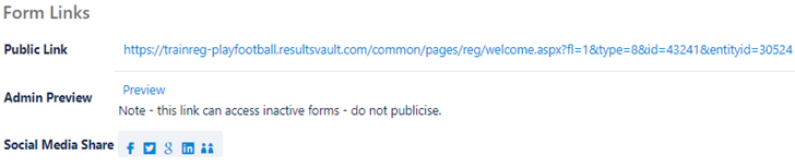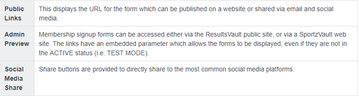 | Status | ACTIVE - the form is publicly available and may be accessed via the Public Access URLs or via the club finder in the public portal. INACTIVE - the form is not publicly available and can only be previewed with the provided links. TEST MODES - the form is only available by clicking the Public Access URLs. When in test mode, the public form displays a red label indicating that it is in test mode. Forms that are being set up should be set to test mode and only switched to ACTIVE when they have been finalised. Anyone trying to access a form when in TEST MODE, without the correct access URL, will be denied access. TEST MODE ACCESS, TEST MODE GATEWAY - When both the form and payment gateway are set to test mode (if the gateway supports it) then transactions made through the form will establish a connection to your gateway but no funds will be processed. All gateways have different ways of operating under test mode. Contact support for more information. TEST MODE ACCESS, PROD MODE GATEWAY - When the form is in test mode and the payment gateway is set to production mode, a real card must be supplied for live gateway testing.