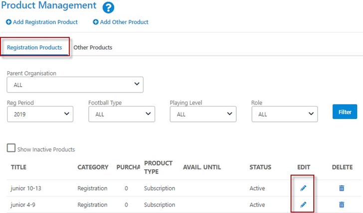 A Registration Product is a mean of categorising registrations into a specific group and defining the fee that must be paid when a player/Participant of that age range looking to register.