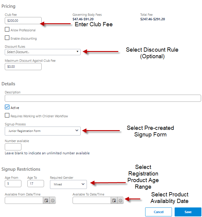 Login to Club Admin> Menu: Registration>Product Management > Add Registration Product