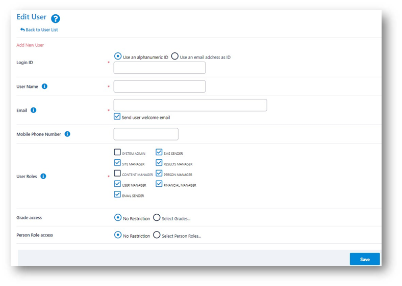 Principal User | High level system administration, can create new accounts for other users in their organisation. Create 2 Super User Accounts. One should be set as the Principal User. SITE MANAGER USER MANAGER** CONTENT MANAGER EMAIL SENDER SMS SENDER RESULTS MANAGER PERSON MANAGER ADMINISTER CHILD FINANCIAL MANAGER