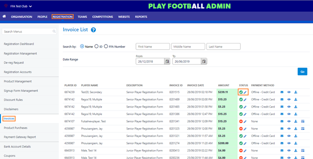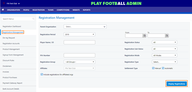 2. Search the registrant using their name, player ID or FFA ID as well as the date range of placement of registration. Once entered click [Go].