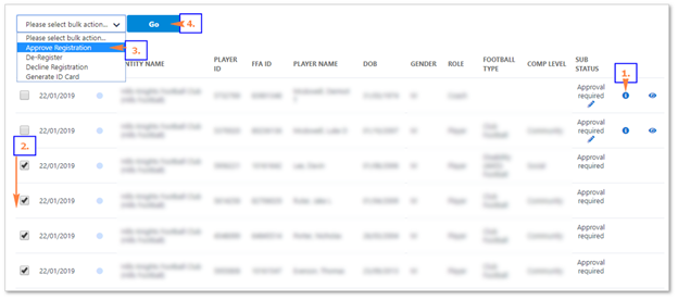 6. Tick the box/s next the registrant/s who have under ‘Sub Status’ Approval required listed, click [Please select bulk action] then [Approve Registration] and finally [Go].