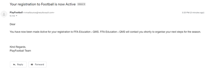 8. An email will be sent out automatically informing the registrant that they have been made active.