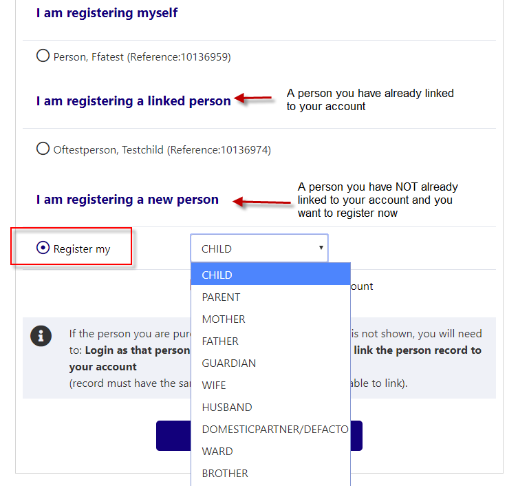 b) Register my \ applicable relationship option (Use this option to register a person that you NOT already linked to your account)