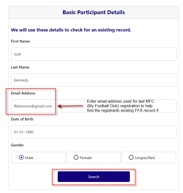 ** IMPORTANT - in order to find if the registrant has an existing FFA registration record - Enter in the email address used for their last MFC (My Football Club- 2018 or prior) registration (if known) and click Search
