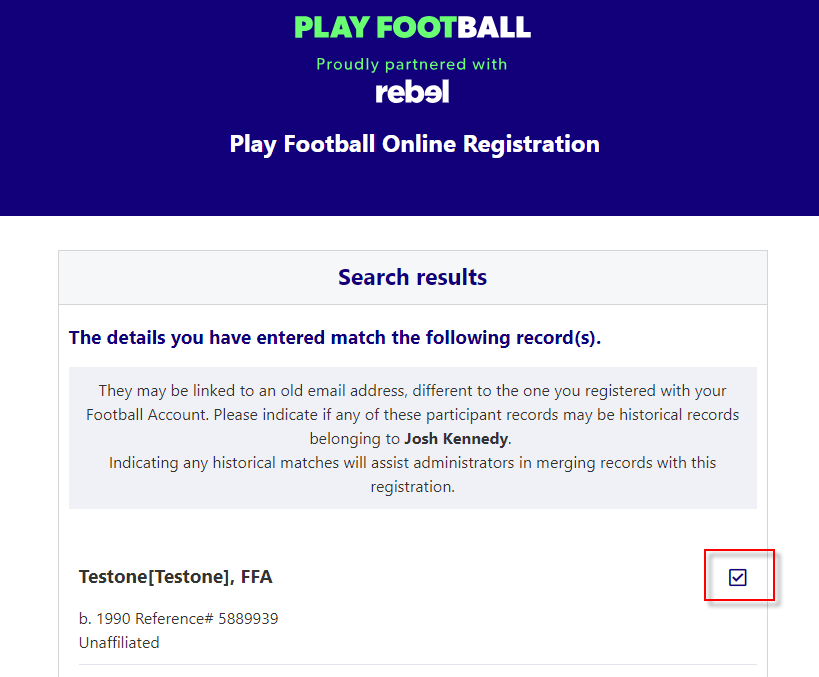 Tick boxes that relate to any historical matches, this will assist administrators in merging records with this new registration - then click Continue