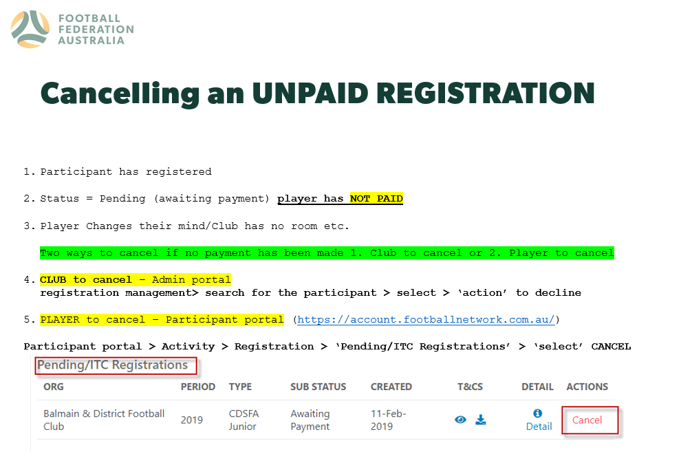Cancelling an Inactive (UNPAID) registration - club & Player