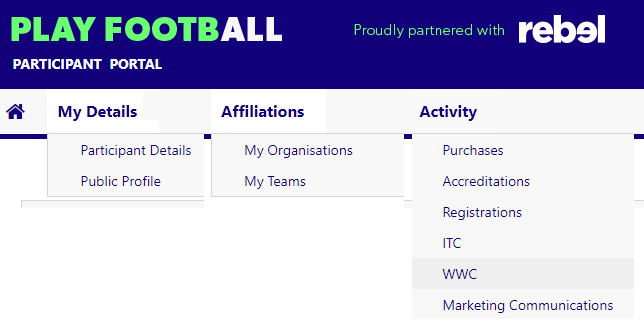 The Participant Portal has 3 main Menu options they are: My Details, Affiliations & Activity