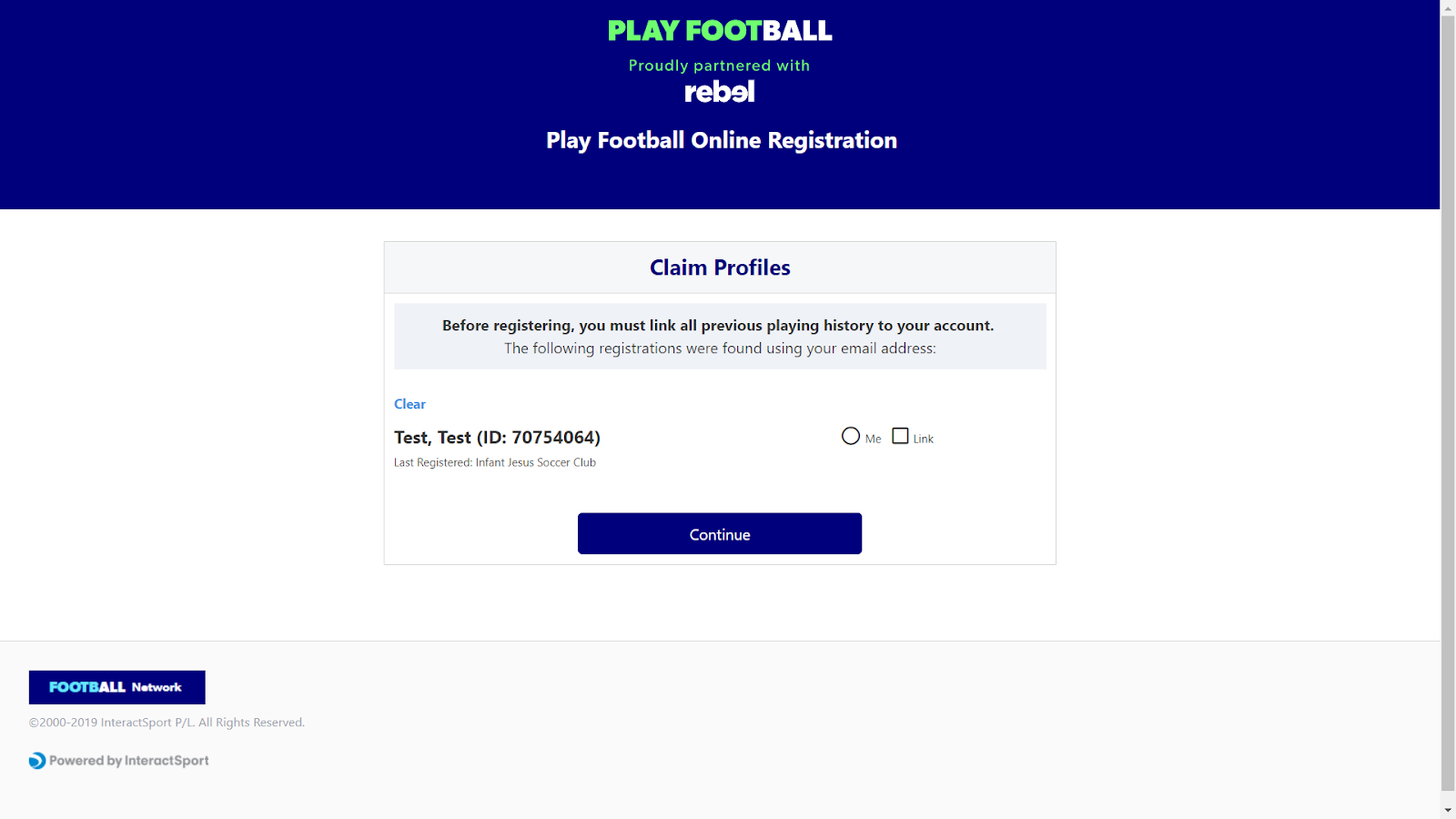 As soon as you have selected “Start my registration”, the page will be directed to Claim Profiles, if you’re the account holder tick the “Me” box and for your children or relatives have the ‘Link” box ticked next to each of their names, select continue.