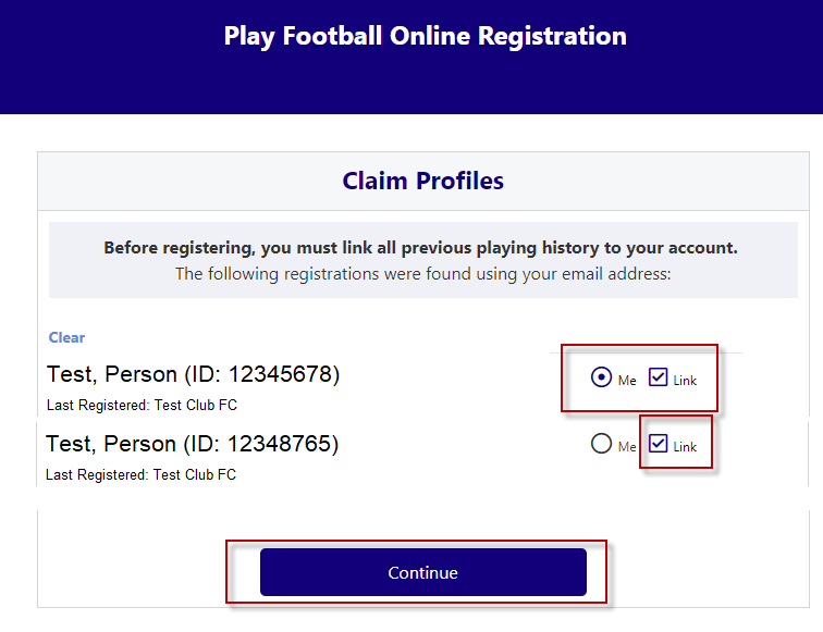 4. Select Me and Link to any record that you historically owned from the old My Football Club System \ Click Continue