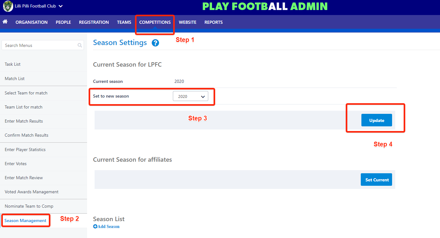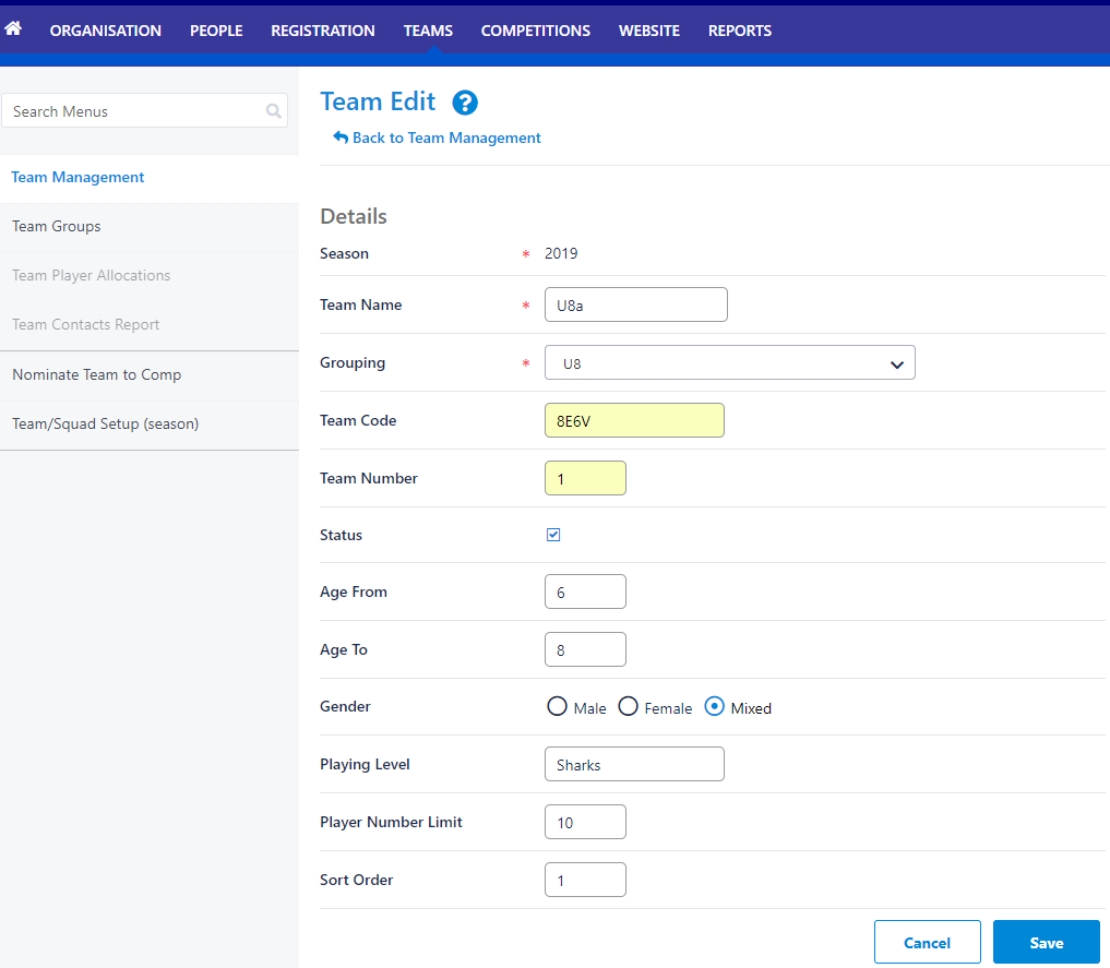 - Enter the Sort Order of your team, this determines how you want to view the team ordering on the summary screen. Eg U8a Sort Order = 1, U8b Sort Order = 2, U8c Sort Order = 3 etc