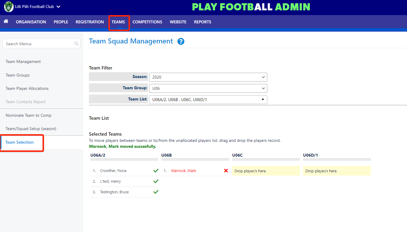 - Drag registrants into your selected team (you can move one than one player if you hold Ctrl on your keyboard and tick each player with your mouse/pad)