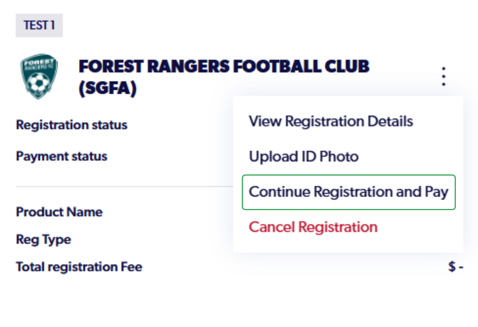 7. Click on the "Three Dots" and Select "Continue Registration and Pay"