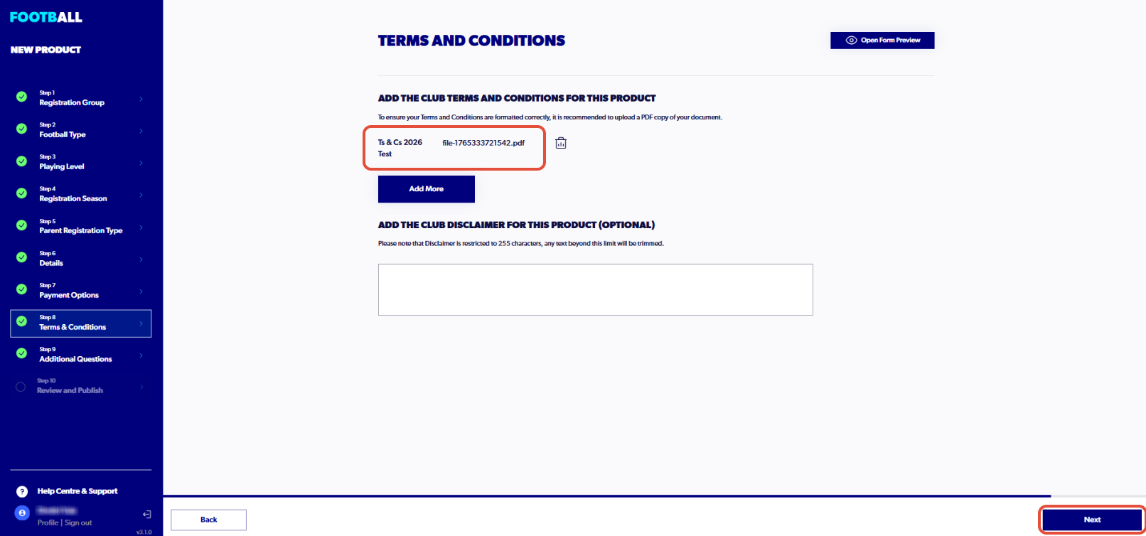 The Terms and Conditions for each organisation must be uploaded while creating the registration type or product.