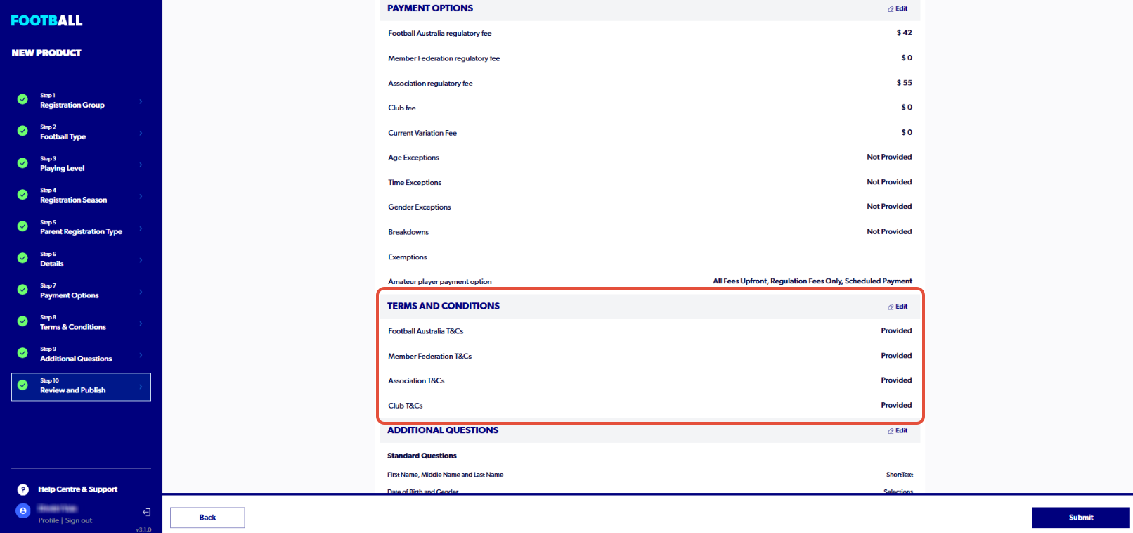 5. Terms and Conditions - Review. Click on "edit" to adjust the Terms and Conditions at the organisations