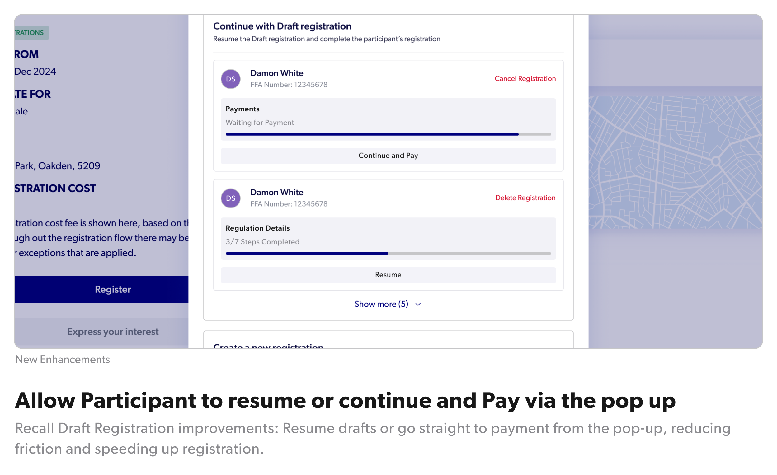- The release of a new feature, the ability to recall a draft registration. So that when a participant starts a new registration, the system will prompt if they already have a registration (for themselves or their family members) for the same product and allow them to either resume or continue and pay instead of creating a duplicate